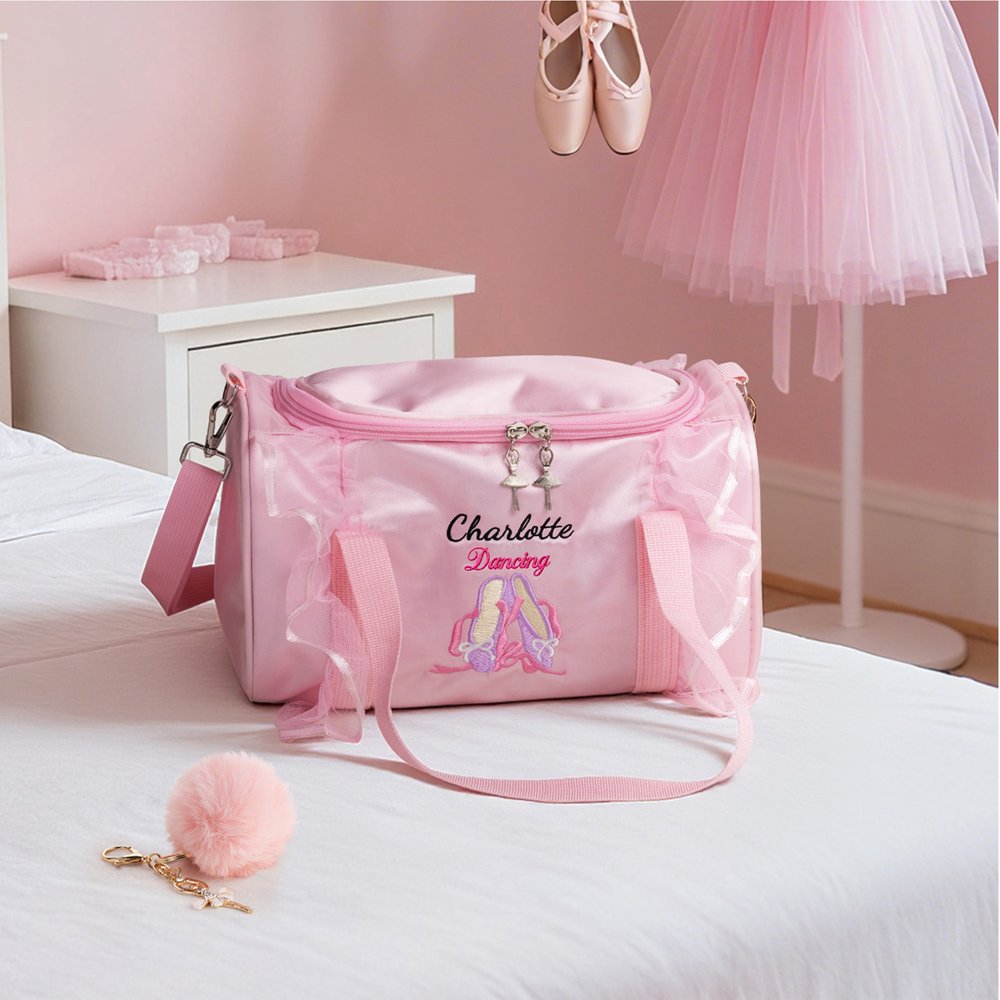 You can choose from a wide range of embroidery thread colours and customize with a name. The bag features embroidered ballet shoes, the word “Dancing,” and comes with ballet-themed details like ballerina zipper charms and a pink pom-pom keychain. This level of customization turns a functional bag into a unique keepsake that celebrates a dancer’s passion and identity.