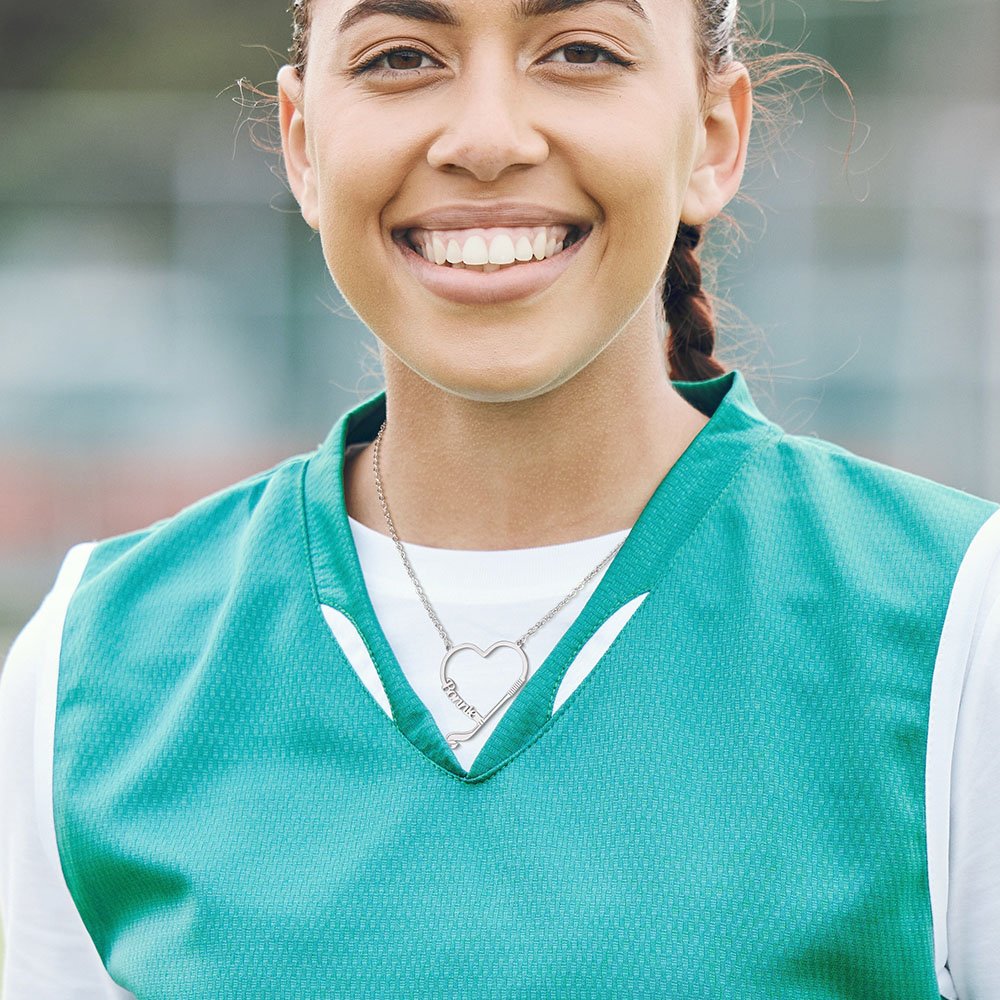 Elegant heart-shaped pendant featuring a hockey theme. Personalized name engraved on the side. The perfect blend of sport and style. Available in classic white gold, romantic rose gold, or traditional yellow gold. Each finish offers unique elegance. Professional plating ensures lasting shine.